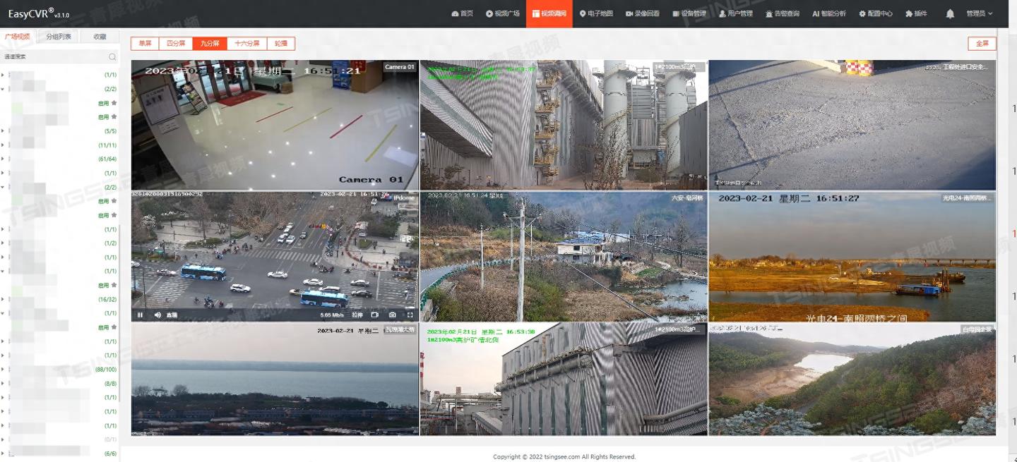 在视频监控的服务能力上,安防监控系统EasyCVR具备视频监控直播、视频轮播、视频录像、云存储、回放与检索、智能告警、服务器集群、语音对讲、云台控制、电子地图、H.265自动转码H.264、平台级联等能力。平台可以将分散的各类视频资源进行统一汇聚、整合、集中管理、实现视频资源的鉴权管理、按需调阅、全网分发,分发的视频流包括:RTSP、RTMP、HTTP-FLV、WS-FLV、HLS、Webrtc等,可在多终端设备上播放,包括:电视墙、拼接电子大屏、电脑端、手机端、移动APP等,方便管理人员随时随地查看现场的监控视频。